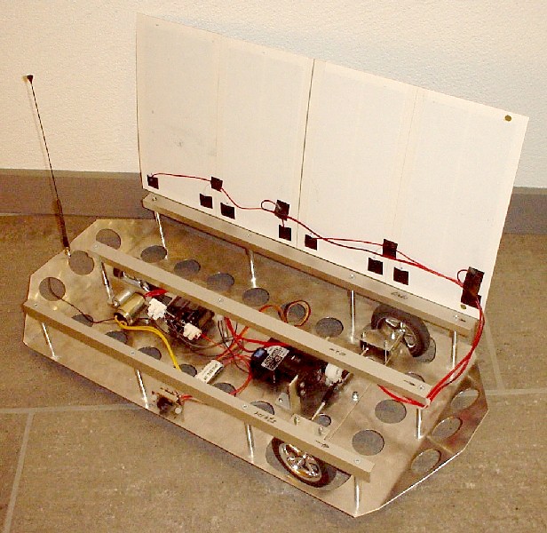 Fernsteuerung, als auch der Antriebsmotor werden mehr oder weniger direkt aus den Solarzellen versorgt. Damit auch kleinere Schattenstrecken befahren werden könne, sind sechs Gold Cap's mit je 10 Farad als Puffer eingebaut. |